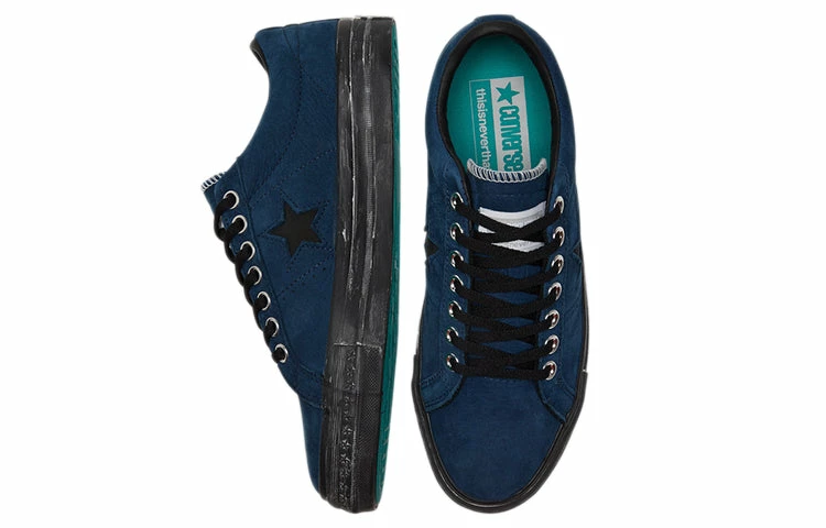 We’re excited to introduce the thisisneverthat x Converse One Star Low ‘New Vintage’! The shoe features a blue premium nubuck upper with a low-cut collar lined in black leather. The black One Star logo, chrome eyelets and dual-branded woven tongue tag give the shoe an edgy look that is sure to turn heads. The low-top is mounted on a distressed black rubber midsole with throwback embossed-star detailing on the toe bumper. Underfoot, a turquoise rubber outsole delivers an unexpected pop of color.Whether you’re hitting the streets or the courts, this sneaker is sure to up your game.