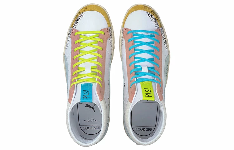 The Puma Michael Lau x Ralph Sampson 70 Mid ‘Scribble’ is a special edition shoe that was released in collaboration with the Hong Kong artist, Michael Lau. The shoe features a white leather upper with scribbled lines throughout its construction, giving it a unique and creative look. The Formstrip, toe cap, and eyestay are all made from suede and feature pastel hits for an added pop of color. The medial side of the shoe includes Michael Lau’s signature, while the tongue tags feature ‘PLS!’ in mismatched hues. The off-white rubber cupsole provides a contrast to the upper and completes the look of the shoe.