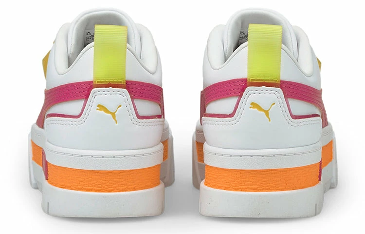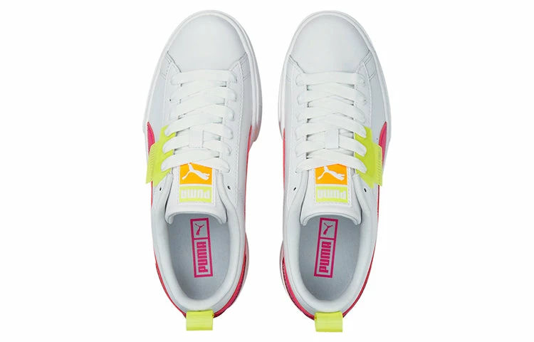 With an eye-catching design and retro-inspired silhouette, the PUMA Women’s Mayze City Lights sneakers are perfect for everyday wear. The crisp white leather upper is contrasted by a fuchsia-colored Formstrip and a webbing heel loop in neon yellow, while the transparent TPU piece integrated into the laces and marked with a PUMA No. 2 logo adds a touch of fun. The sneaker rides on an exaggerated platform midsole, its raised white sidewalls embellished with a wraparound orange stripe and embossed PUMA branding on the lateral side. Don’t miss out on these must-have sneakers!